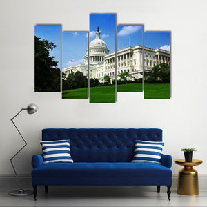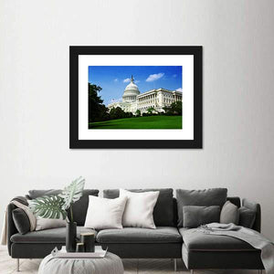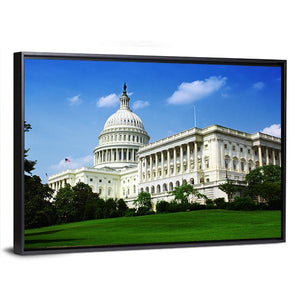 This canvas art beautifully depicts the Wisconsin State Capitol Building, capturing its grand dome and striking columns against a sunny blue sky. The vibrant greens of the lawn and trees add a touch of nature, evoking a patriotic and uplifting atmosphere.