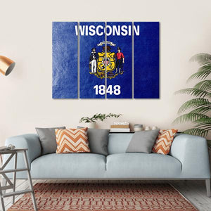 This canvas art features the Wisconsin state flag, portraying a patriotic and vintage atmosphere. With a rich palette of blue, gold, white, and red, it proudly displays Wisconsin's coat of arms and the year 1848 alongside the motto 'FORWARD'.