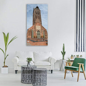 This canvas captures Wismar’s historic center with a low-angle view of a brick church tower, pointed spire and arched windows set against a cloudy blue sky. The realistic, grand composition carries a historical, imposing mood that fits heritage-inspired living rooms, studies, or architectural spaces.
