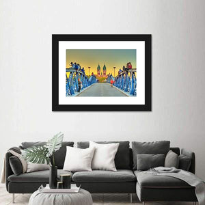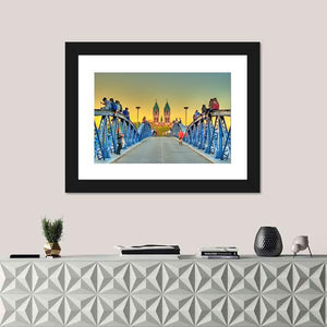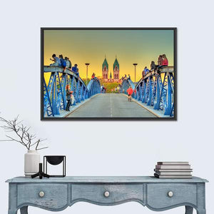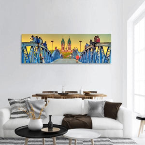 A panoramic cityscape of the Wiwili Bridge in Freiburg, Germany, showing people on the bridge, a cyclist, and twin-spired buildings against a colorful sunset. The scene reads as vibrant and lively, with bold blues, yellows, oranges, and reds. Works well in modern living rooms or hallways as a colorful wall accent.