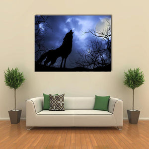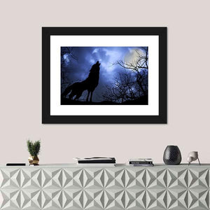 This striking canvas art features a wolf howling under a full moon, set against bare trees. With its dramatic silhouette and rich blue and black palette, it adds a mysterious, wild touch to your décor.