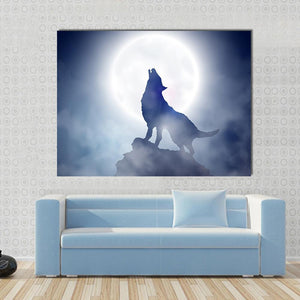 This striking canvas art features a silhouette of a wolf howling under a glowing full moon, surrounded by foggy mist. The mystical and dramatic scene is set against a soothing palette of blue, white, and gray, making it a perfect addition to modern decor.