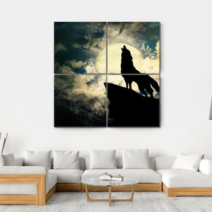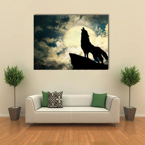 This striking canvas art captures a lone wolf silhouetted against a full moon, set within a dramatic night sky. The composition features clouds and a rocky outcrop, conveying a wild, untamed spirit. It's a perfect addition for those looking to bring a touch of nature's majesty into their home.