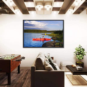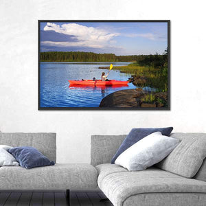 This canvas art captures a serene scene of a woman kayaking in a peaceful lake surrounded by lush forests and rocks. Its tranquil vibe and naturalistic style make it perfect for enhancing any space with a calming atmosphere.