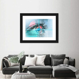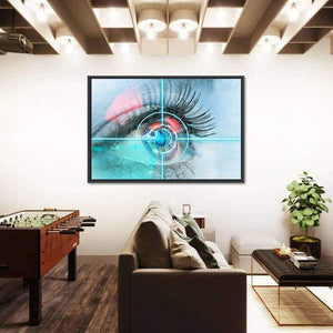 A close-up, centered view of a woman’s eye with a stylized scan overlay and crosshairs. The graphic, modern image reads futuristic and clinical with blue, teal, red, black and white tones. It fits well in modern rooms or science-inspired decor where bold, graphic art is wanted.
