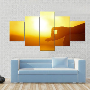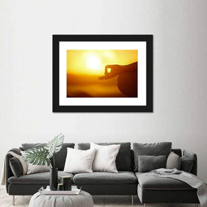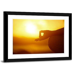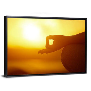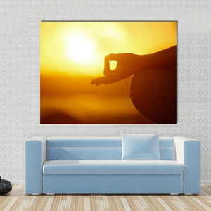 This canvas art captures a serene silhouette of a woman in a yoga lotus pose at the beach. The golden and orange hues evoke a peaceful ambiance, making it a calming addition to any room.