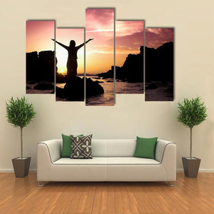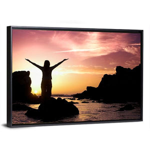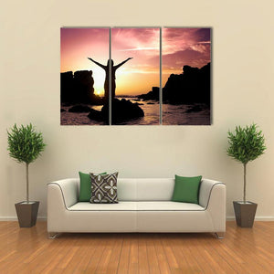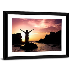 A lone woman silhouette stands with arms outstretched against a sunset over the ocean and rocky shore, shown in purple, orange, pink, black and brown. The modern composition follows the rule of thirds to create a peaceful, uplifting atmosphere that fits contemporary home room decor.