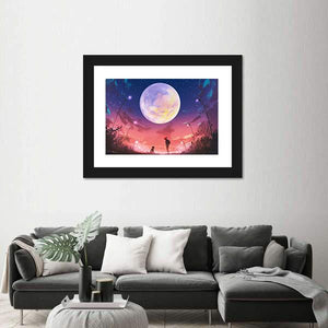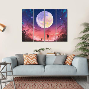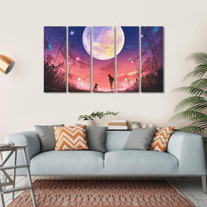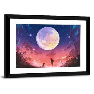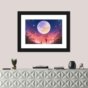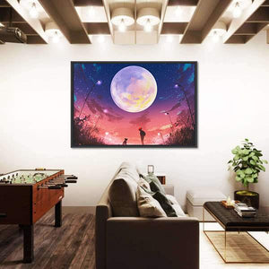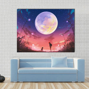 This canvas artwork features a serene scene of a woman and her dog under a beautifully textured moon. The dreamy palette of pinks and blues, along with glowing street lamps, creates a magical night atmosphere perfect for any room.