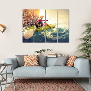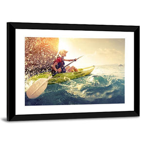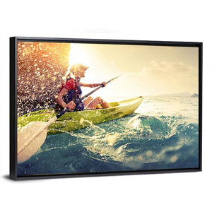 This vibrant canvas wall art depicts a kayaker navigating sparkling ocean waters under bright sunlight. The energetic scene captures the essence of adventure and outdoor sports, making it a perfect addition to a nature-inspired décor.