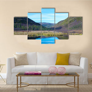 This landscape canvas art features a tranquil lake framed by autumn hills and majestic mountains. The serene palette of blues, greens, and earthy tones creates a peaceful atmosphere, making it a lovely addition to your wall decor.