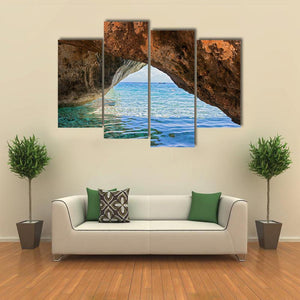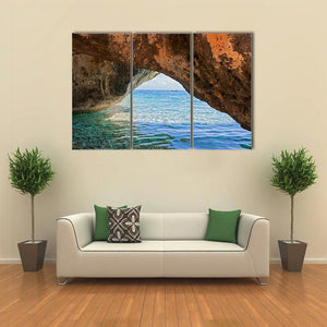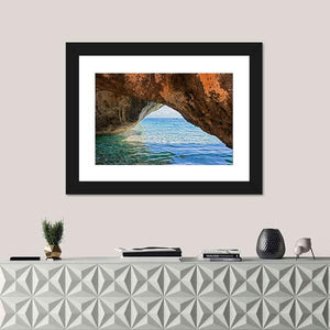 This canvas art beautifully captures a serene view of a tropical bay framed through an archway. The tranquil scene features clear turquoise waters, a pebbled seabed, and distant boat, inviting a sense of calm to any space.