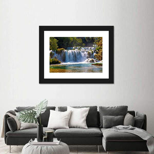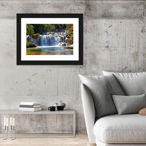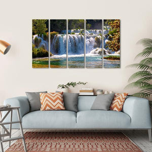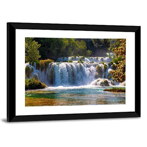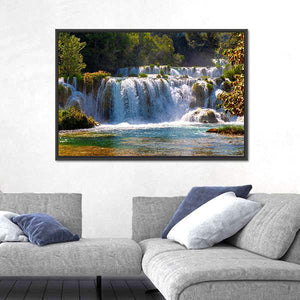 This canvas wall art captures the beauty of waterfalls in Krka National Park, showcasing a serene scene of clear turquoise water cascading over rocks. Surrounded by lush greenery and illuminated by sunlight filtering through the trees, it brings a peaceful, natural vibe to your space.