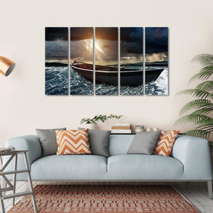 This captivating canvas depicts a wooden boat navigating a stormy sea. With rough waves and dramatic sunbeams breaking through dark clouds, it evokes a mood that is both stormy and hopeful, perfect for adding a dynamic touch to your space.