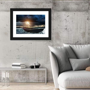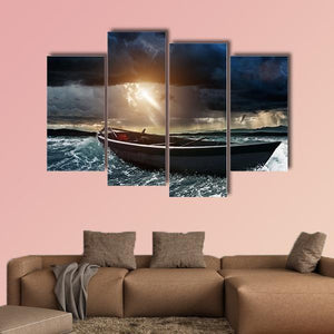A wooden boat battles a stormy sea with sunbeams breaking through dark clouds and choppy waves. The rule-of-thirds composition and a high-contrast palette of dark blue, gray, yellow, and white create a cinematic, dramatic yet hopeful scene. Suited to modern rooms and nature-focused wall decor.