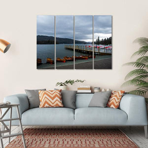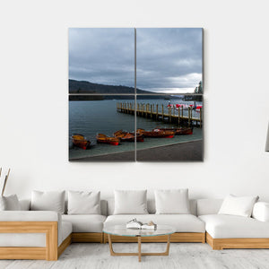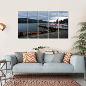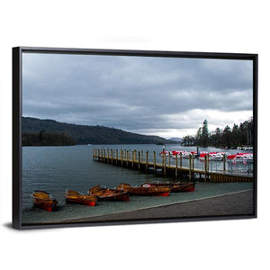 This canvas art depicts a tranquil scene of rowboats lined up on a wooden dock against the serene backdrop of the Lake District. With its overcast skies and earthy color palette, it brings a touch of nature's calmness to any space.