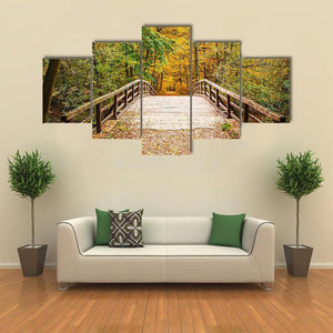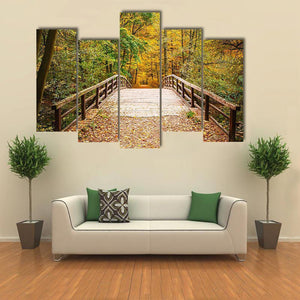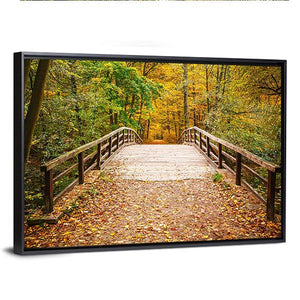 This canvas art features a serene wooden bridge nestled in an autumn forest, surrounded by a vibrant palette of browns, yellows, and greens. It beautifully captures the tranquility of falling leaves, making it a perfect addition to any nature-inspired decor.