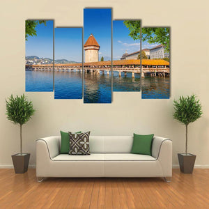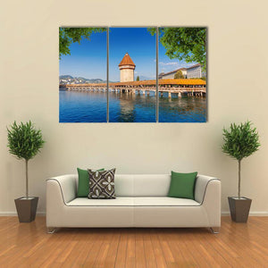 A photorealistic landscape of Luzern, showing the wooden Chapel Bridge and its tower framed by trees over calm blue water and a clear sky. The serene, picturesque daytime scene brings a quiet, natural feel and works well with modern room decor or as house wall art.