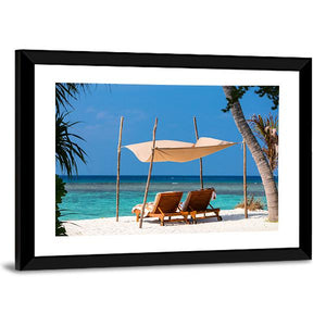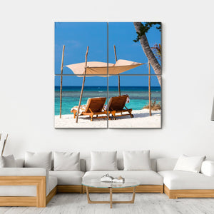 This canvas art features two empty lounge chairs set against a serene tropical beach. With clear turquoise water and soft white sand, it creates a peaceful atmosphere that invites relaxation.