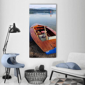 A wooden paddle boat rests on a calm lake beneath distant mountains, captured in a realistic nature scene. Gentle reflections on the water and a small sailboat in the distance create a peaceful, tranquil mood. Works well in modern or nature-inspired room decor.