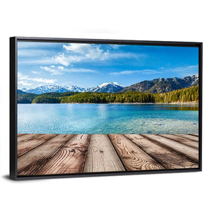 This canvas wall art captures a serene lake surrounded by majestic mountains and a clear blue sky. The rustic wooden planks in the foreground invite a sense of tranquility, making it a beautiful addition to any nature-inspired decor.