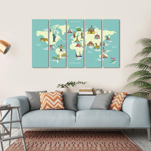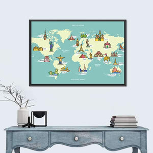 This illustrated canvas wall art features a world map adorned with playful symbols of famous landmarks. The design incorporates vibrant colors like teal, yellow, and red, creating an educational and whimsical atmosphere that's perfect for any room.