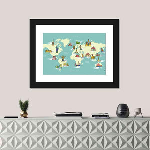 A colorful world map that pairs labeled oceans with stylized illustrations of famous landmarks in a modern, cartoonish style. The playful, educational design (teal, yellow, red, green, blue) suits room decor in study areas, kids’ rooms, or other modern spaces. Icons are placed geographically to make exploring the globe informative and fun.