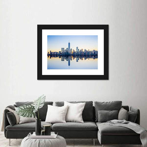 This canvas wall art features a serene cityscape of the World Trade Center at twilight, showcasing reflections in tranquil blue and orange hues. Ideal for modern decor, it brings an urban vibe to any space.