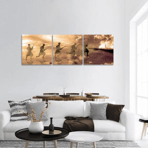 Depicts silhouetted soldiers and rifles in a sepia-toned panoramic World War I scene with a somber, cinematic mood. Cloudy skies and water reflections give the image a dramatic, historical atmosphere. This canvas suits a study, den, or other room with vintage or military-inspired decor.