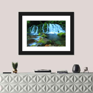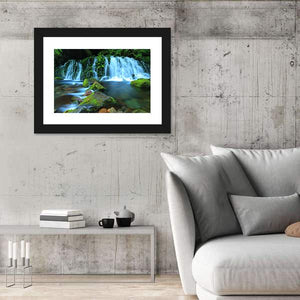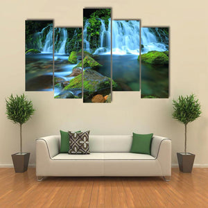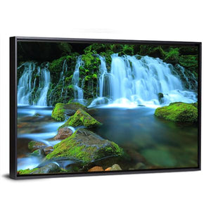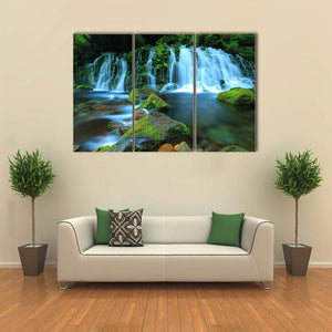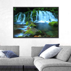 Xia Yuan Waterfall Canvas Wall Art depicts a photorealistic waterfall, mossy rocks and a flowing stream with a long-exposure water effect, creating a serene, refreshing mood. The green and blue palette suits modern house interiors and room decor like living rooms and bedrooms.
