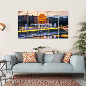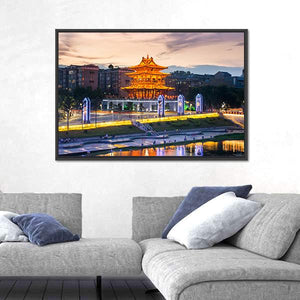 This vibrant canvas art captures the magic of Xiaoyao Tower in Guilin, China. Featuring a colorful city skyline reflected in the river at dusk, it brings a lively and festive atmosphere to any space.