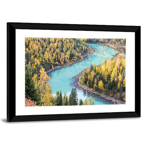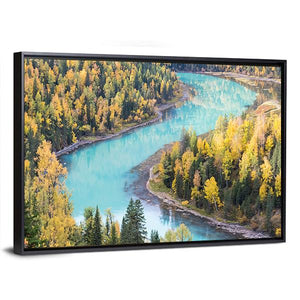 Xinjiang Kanas Autumn Landscape shows a turquoise river winding through autumn forest and distant mountains in a realistic nature-photography style. The scene feels serene and vibrantly peaceful, with blue-green and warm yellow-brown tones that suit modern room decor and nature-themed spaces.