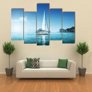 This beautiful canvas features a serene sailboat gliding through calm blue waters, framed by distant islands. The tranquil palette of blue, white, and green creates a peaceful atmosphere, making it a lovely addition to any modern space.