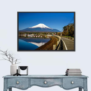 Yamanaka Lake With Mount Fujisan shows Mount Fujisan rising over a calm, reflective lake in a photographic, realistic style. A road curving to the right and a wooden fence lead past a town toward the snow-capped peak, rendered in blues, whites, greens and browns for a serene, majestic mood. Works well as room decor in homes or modern, nature-inspired interiors.