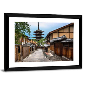 This photorealistic canvas art captures the serene beauty of Japan's Yasaka Pagoda set against a quaint street. With a palette of browns, greens, and blues, it conveys a peaceful atmosphere, perfect for enhancing any living space.
