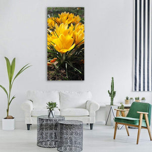A photorealistic close-up of yellow crocuses, with delicate petals, thin green stems and a hint of grass, soil and fallen leaves. The image captures a fresh, vibrant spring mood through warm yellow, green and brown tones. It suits modern or nature-inspired room decor and brings subtle botanical energy to walls.
