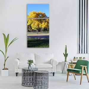 A naturalistic landscape featuring a tree with bright yellow leaves beneath a clear blue sky. The peaceful, vibrant autumn scene—with touches of green grass and a quiet road—brings a bright, nature-focused look for modern and nature-inspired rooms.