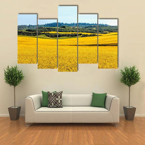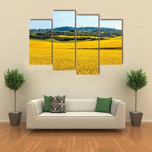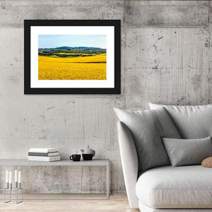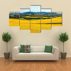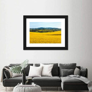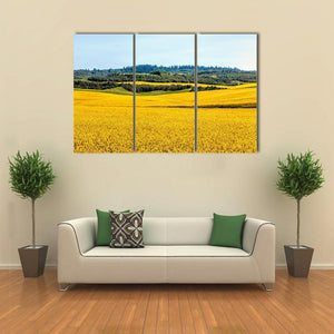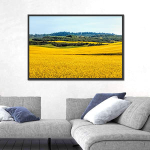 Yellow Mustard Fields Canvas Wall Art depicts a photographic landscape of a field of yellow flowers, rolling hills and a distant forest beneath a clear blue sky. Bright sunlight and a yellow–green–blue palette create a peaceful, vibrant, serene mood that suits modern interiors and nature-themed room decor.