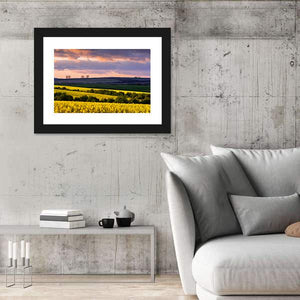 Yellow Rape Field Landscape Canvas captures rolling hills and sunlit yellow fields beneath a soft purple-pink sunset sky. The panoramic, naturalistic composition layers yellow and dark green fields with distant trees to create a serene, peaceful atmosphere. It fits well in modern or nature-inspired interiors such as living rooms and bedrooms.