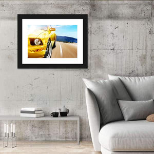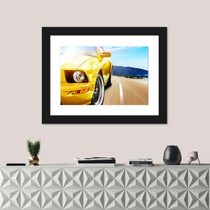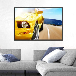 This canvas artwork features a dynamic close-up of a yellow sport car racing along a narrow road, surrounded by majestic mountains. The energetic and exciting composition, highlighted by sun glare and tire spin, brings a vibrant ambiance to any space.