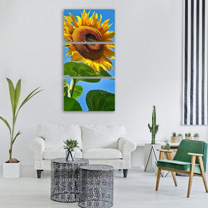 Vibrant, cheerful, this close-up canvas captures a yellow sunflower against a blue sky, with green leaves and a small bee rendered in a realistic style. The bright palette—yellow, brown, green and blue—provides a sunny focal point for nature-inspired or modern room decor.
