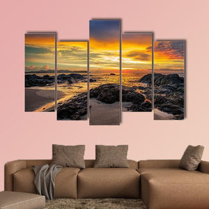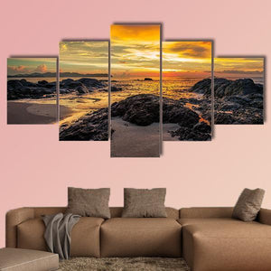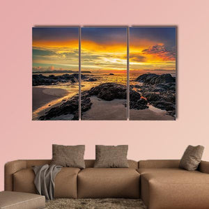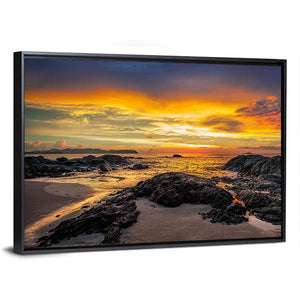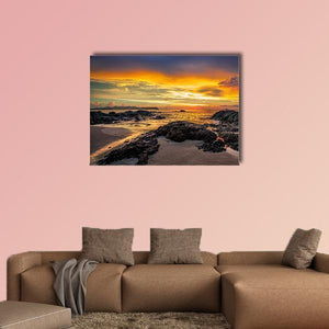 A photographic canvas showing a yellow-orange sunset over the sea, with ocean and beach framed by wet rocks that reflect the light. The low-angle, rule-of-thirds composition gives a serene, majestic and dramatic mood that suits modern homes and room decor.
