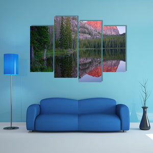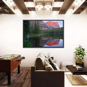 This canvas features a serene landscape of Yellowjacket Lake with the majestic Sugarloaf Mountain in the background. The scene captures the tranquil beauty of evergreen trees and a rocky peak reflected in still water, inviting a sense of calm into your space.