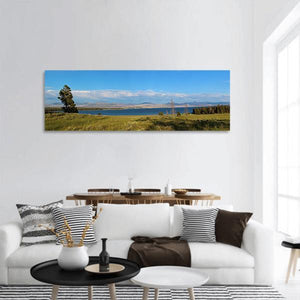 This panoramic print captures Yellowstone Lake with grassland, trees and distant mountains under a few soft clouds. A lone tree in the foreground and subtle power lines add quiet, realistic detail to the peaceful, vast scene. Natural blues, greens and earthy tones suit modern or nature-themed interiors as room decor.