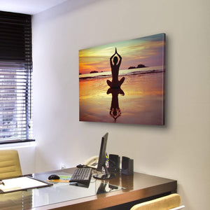 This canvas features a serene silhouette of a yoga pose against an ocean sunset. The vibrant palette of orange, pink, and purple creates a peaceful atmosphere, ideal for any calming space in your home.