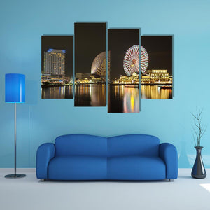 This canvas shows the Yokohama skyline at the Minato Mirai waterfront, with a ferris wheel, lit buildings, and reflections on the water. Rendered in a photorealistic, modern style with blues, yellows, whites and oranges, it captures a vibrant, energetic nocturnal city mood and suits modern living rooms or offices.