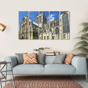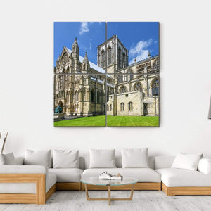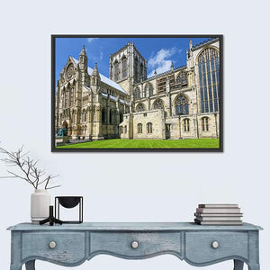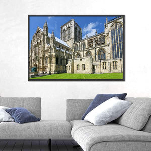 This canvas wall art beautifully captures the grandeur of York Minster, showcasing its Gothic architecture against a sunny sky. The vibrant palette of blue and green, along with the intricate details of large windows and lush grass, brings a historic charm to any space.