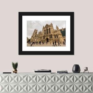This canvas captures York Minster’s Gothic cathedral in a low-angle, wide cityscape that highlights the rose window and soaring architecture. Muted beige, grey, green, and blue tones create a grand, overcast daytime mood; people walking in front add quiet life, making it well suited for living rooms, studies, or hallways.