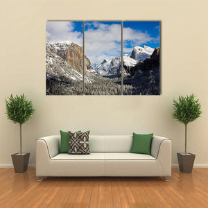 This canvas features a breathtaking view of Yosemite Valley blanketed in snow, highlighting majestic snow-covered mountains and the iconic El Capitan. Its serene and cold atmosphere, combined with a wide-angle perspective, invites a sense of tranquility into any space.