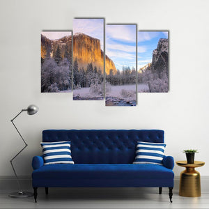 This canvas wall art captures the serene beauty of Yosemite Valley in winter, showcasing snowy mountains, a tranquil river, and a peaceful pine forest. The artwork evokes a majestic atmosphere, making it a great fit for nature lovers and modern decor.