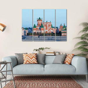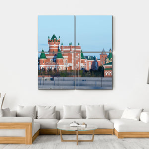 This captivating canvas art features a majestic cityscape of Yoshkar-Ola, showcasing an ornate castle-like building and towering structures with green roofs. The vibrant palette of red, green, blue, and white evokes a historic atmosphere, perfect for enhancing your living space.
